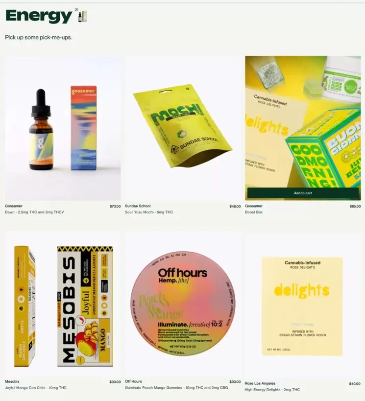A loja online da Gossamer, que começou a vender comestíveis à base de cânhamo em 2024, oferece desde tinturas e balas até pré-enrolados. Os campeões de venda são os produtos com um ou dois miligramas.