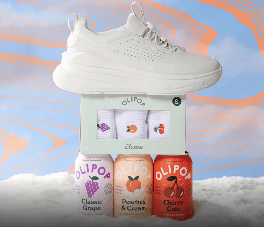 No início deste ano, a Clove lançou um tênis amarelo-manteiga em parceria com a Land O'Lakes, em uma colaboração que viralizou na comunidade da saúde, com mais de 100 milhões de impressões e milhares de tênis cor de manteiga vendidos. E agora, a Clove está lançando uma nova colaboração com a Olipop para meias estampadas com os icônicos símbolos de frutas do refrigerante.