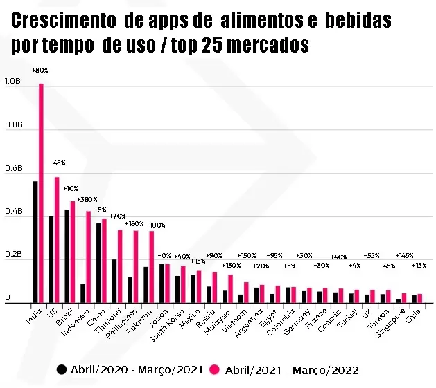 Para acompanhar a agilidade desse mercado, a Data.AI, empresa que tem uma plataforma de inteligência artificial unificada para dados de consumo e estimativas de mercado, mapeou os principais mercados do mundo e publicou recentemente a pesquisa State of Food and Drink on Mobile em 2022, com as principais tendências.