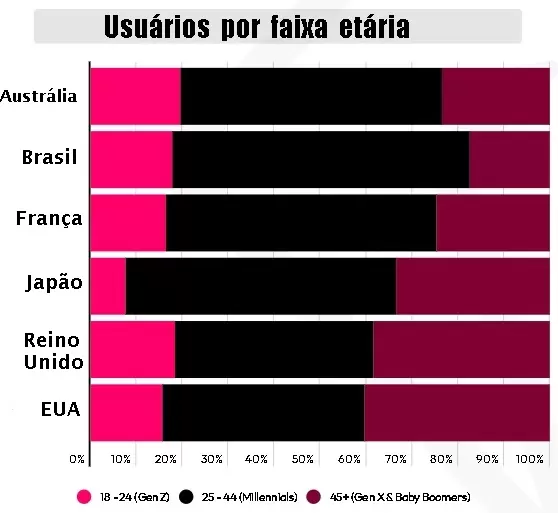 No Brasil, diferente de outros países, o público com idade abaixo de 24 e acima de 45 anos tem muito menos expressão no uso dos aplicativos do que nos outros mercados mundiais. Portanto, se quiser realizar aqui uma ação de promoção de vendas e marketing, melhor ponderar esses percentuais de usuários por faixa etária para definir a estratégia.