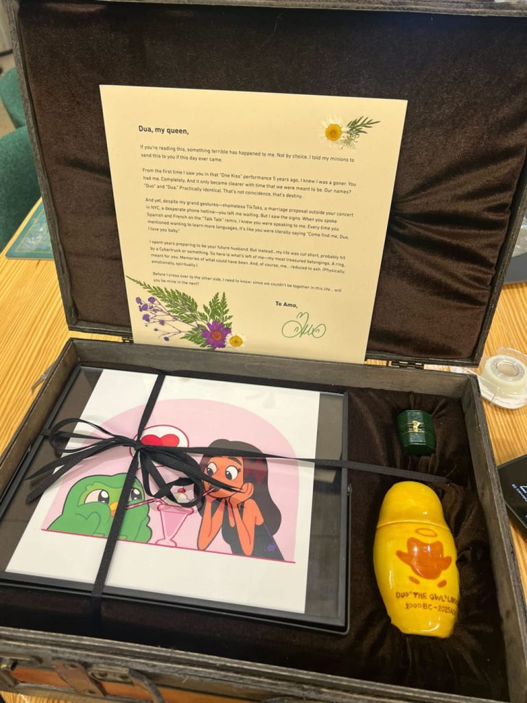 Para agradecer, o Duolingo enviou a ela um kit com uma caixinha de “cinzas do Duo” (na verdade, matcha em pó). Internamente, foi uma festa. Parvez recebeu no Slack uma mensagem do CEO: “a Dua Lipa tuitou sobre a gente!”.